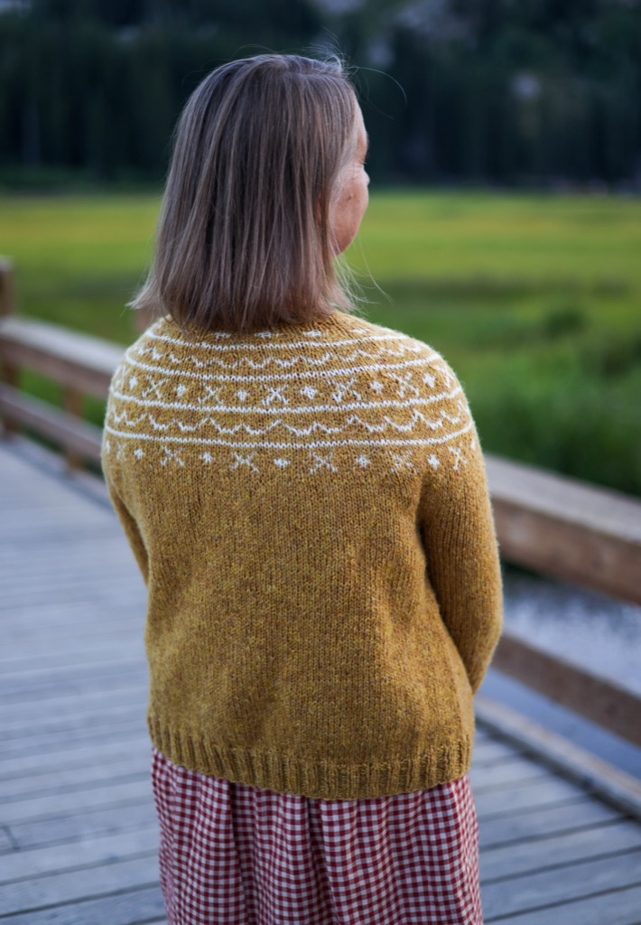 Top-down knitting is a modern way to knit. It starts with the neckband and moves quickly to the colorwork yoke and is knit from top to bottom. I love to jump right to the colorwork. Top down knitting is really a great project for a colorwork class. The yoke is shaped with increases. Once the yoke is completed, the stitches are divided into the sleeves and the body. This method makes it easy to try on your cardigan as you go and tailor-fit the yoke depth and length of the body and sleeves. It also is easy to seamlessly pick up the underarm stitches for the sleeves. It is also very rewarding to have the beautiful yoke smiling at you the whole time you knit the body. It encourages you to finish because you can’t wait to wear it. There is minimal finish work in top-down knitting.