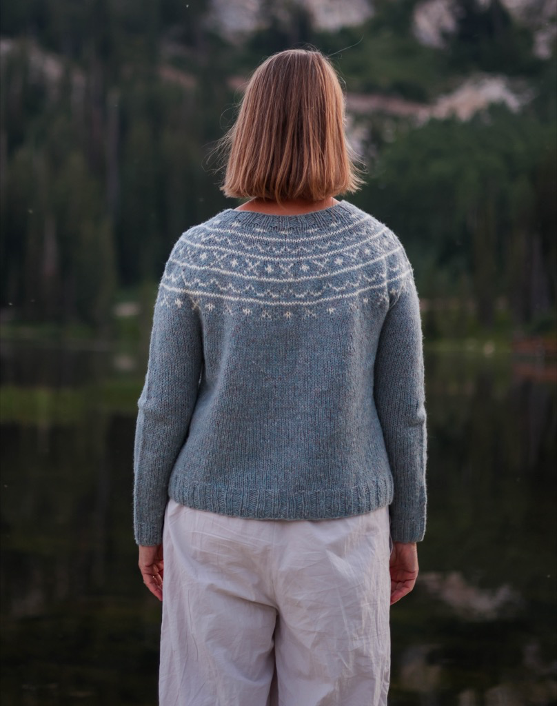 The top-down construction starts at the yoke and ets you begin with the fun colorwork part. I also like that after you have completed the colorwork, it's rewarding to look at while you are finishing the sweater. This construction also makes it easy to try on your sweater as you knit so you can tailor fit the yoke depth and length of your body and sleeves. I also love easy way to pick up and knit the sleeve stitches. Brooks has a magical fit that is super comfortable and flattering.