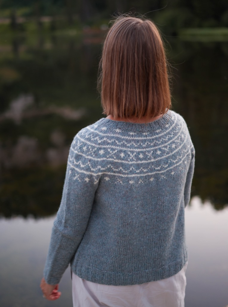 This timeless design was inspired by an antique kitchen bowl that has been in my family longer than I have been. It’s Xs and 0s and the swooping buntings have always reminded me of Norwegian Kransekake (wreath cake). It’s simple, but also a little celebration. For years I have looked at this bowl and thought it should be a sweater. I meant this design to be a year-round sweater, a favorite you can wear all the time. A best friend sort of sweater that is worn through thick and thin. On good days and bad. A constant companion through life. I hope it’s a sweater you reach for when going on a walk or taking a trip to the store, one you grab for sitting outside on a chilly evening or gathering eggs. I knit mine with Biches et Buches Le Lambswool that gets softer with every wear.
