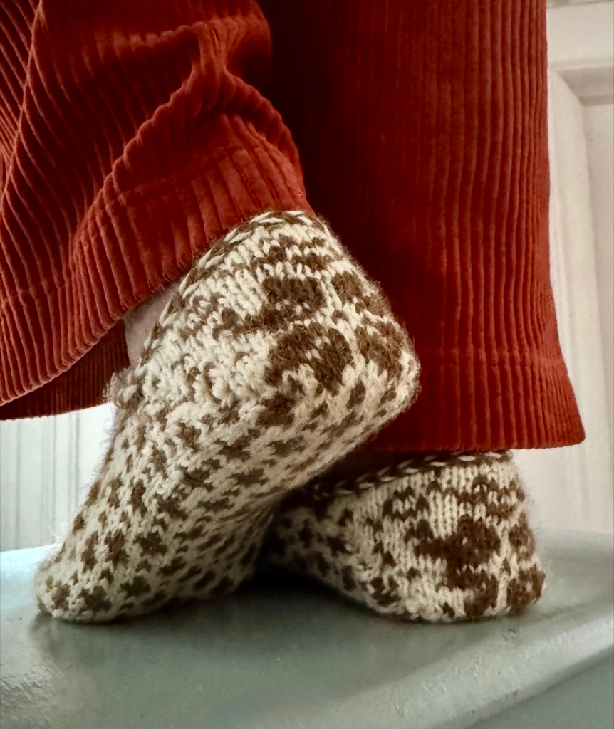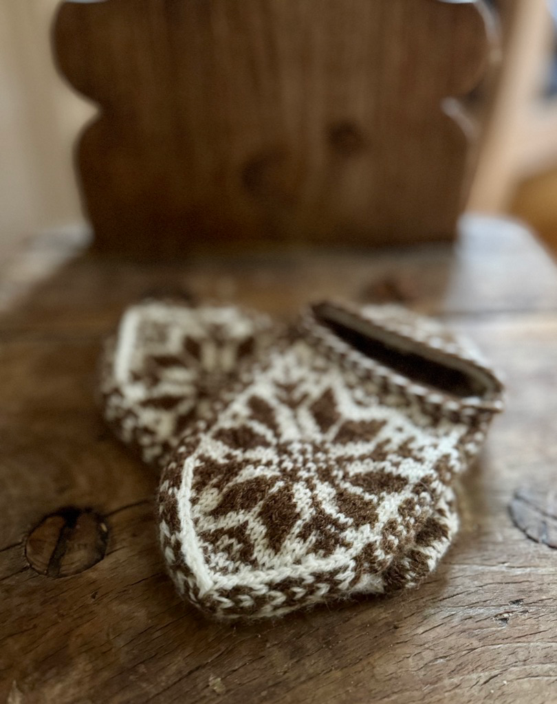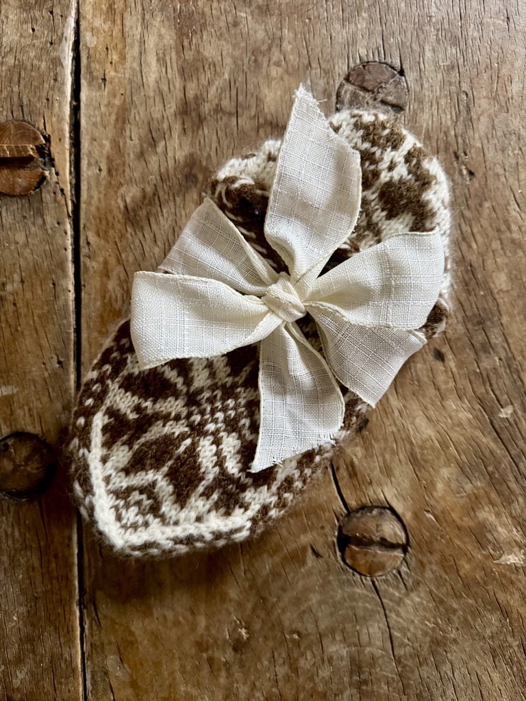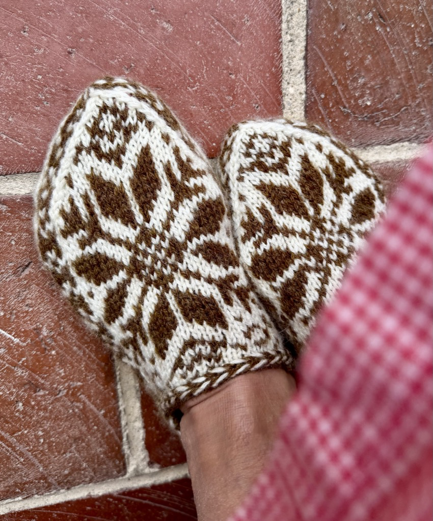 Berte Marie Haggendatter Olsen was my great-great grandmother. Everything I know about her I learned from my grandma while looking at family photos. I choose these colors for these slippers because it reminded me of a photo of my Great Grandpa Olsen when he was a little boy. The photo was taken by a professional photographer is Kristiania.I have loved that photo ever since I was little, and my grandma told me stories of my grandfather and his life in Norway. Lately I’ve been thinking about his mother. How she must have been looking on while that photo was taken. That gave me such a kindred-spirit feeling toward her. I remembered those moments as a mother. So much love. So much hope. So much adoration. I loved that she packed that photo in a trunk and crossed the Atlantic with it tucked amongst her treasures. I’m so glad that she did. That photo links me to her. I know from my grandma that Berte yearned for Norway as she and her family learned a new language and made a new life in the Rocky Mountains. There is so much I could tell you about her! In short, I know that she was a woman of faith, love, hope, and courage. The symbols on this slipper represent just that. The star is for the star of Bethlehem, there is a heart and flower on the top of the toe and heel represents love, courage and hope. The stars on the sole are for loving “more than all the stars in the sky.” And I like to think the tvinnarand braid is a symbol of how our lives intertwine as we travel life’s journey together even generations apart.